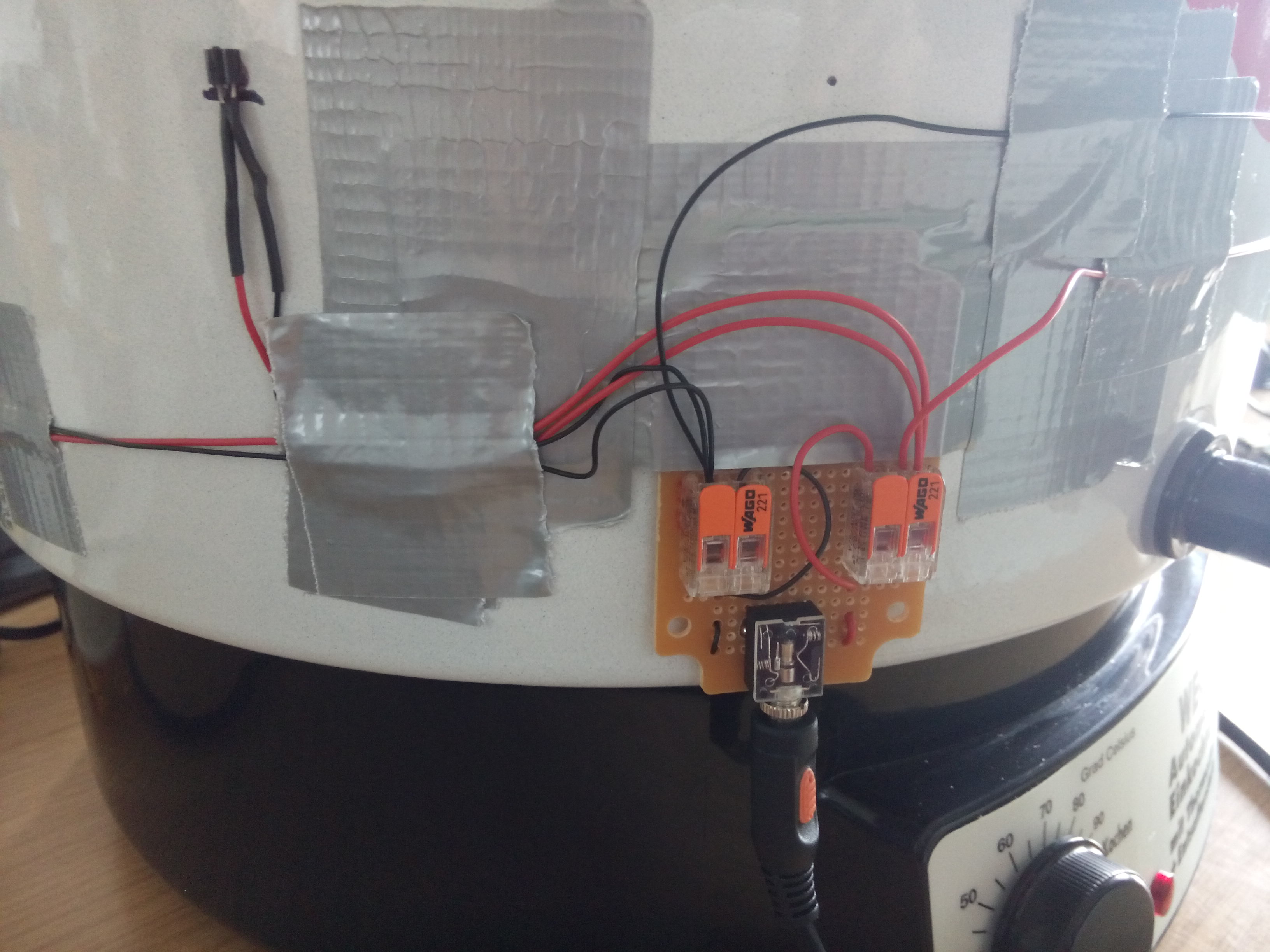 Ich besorgte mir ein Rührwerk und drei DS1820 Sensoren sowie etwas Wärmeleitkleber, damit ich die Wärmeübertragung auf den Sensor möglichst effizient gestalten konnte. Ich klebte die drei Sensoren in einer Höhe von etwa 10 cm über die Unterkante des Einkocher-Topfes und stellte die Verbindung zu meinem Raspi her. (Über einen Klinkenstecker, damit ich nicht immer den Einkocher mit den Kabeln rumstehen hab)