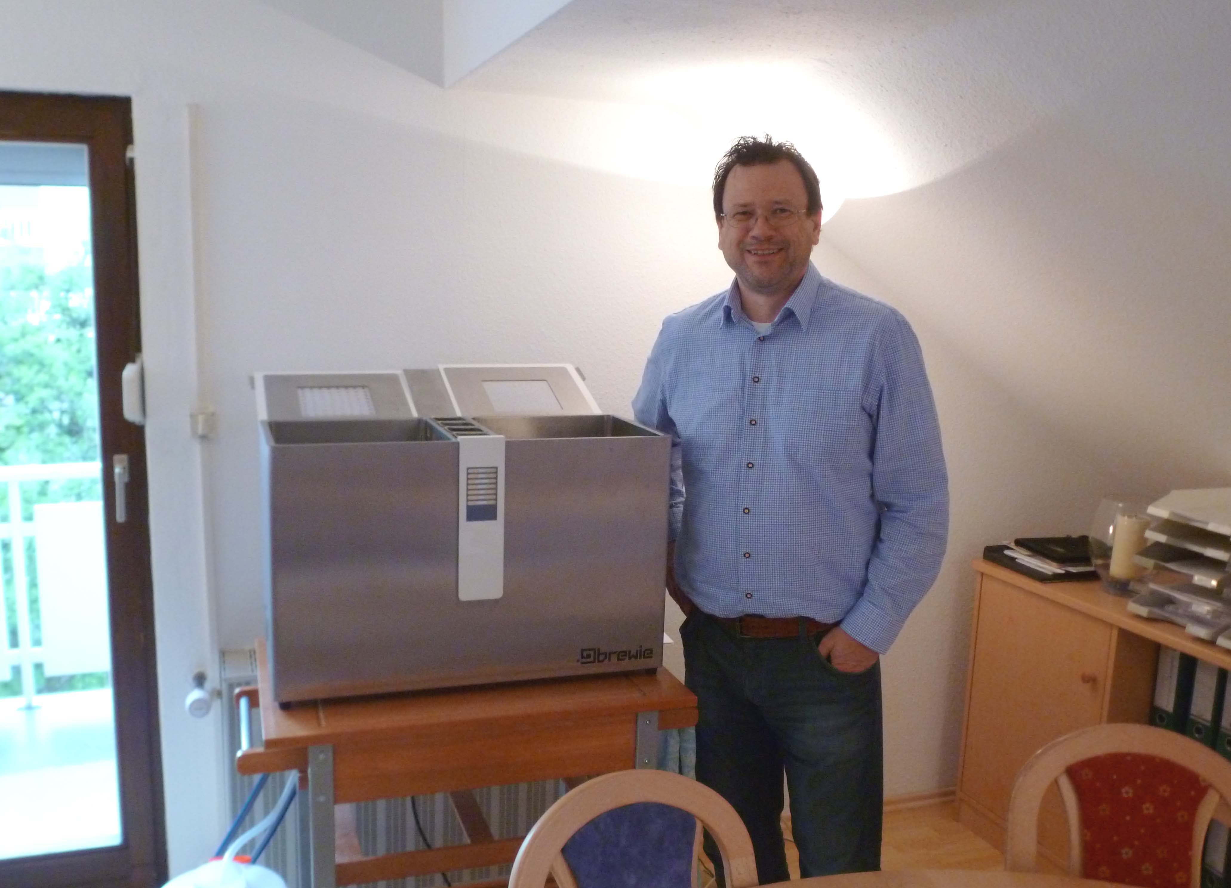 jetzt ist die Brauvorführung vorbei und in kleiner, aber feiner Runde durchlief der Brewie den Test. Es war auch das erste Mal, dass der Brewie zum Schaubrauen in Betrieb war vor Publikum.
