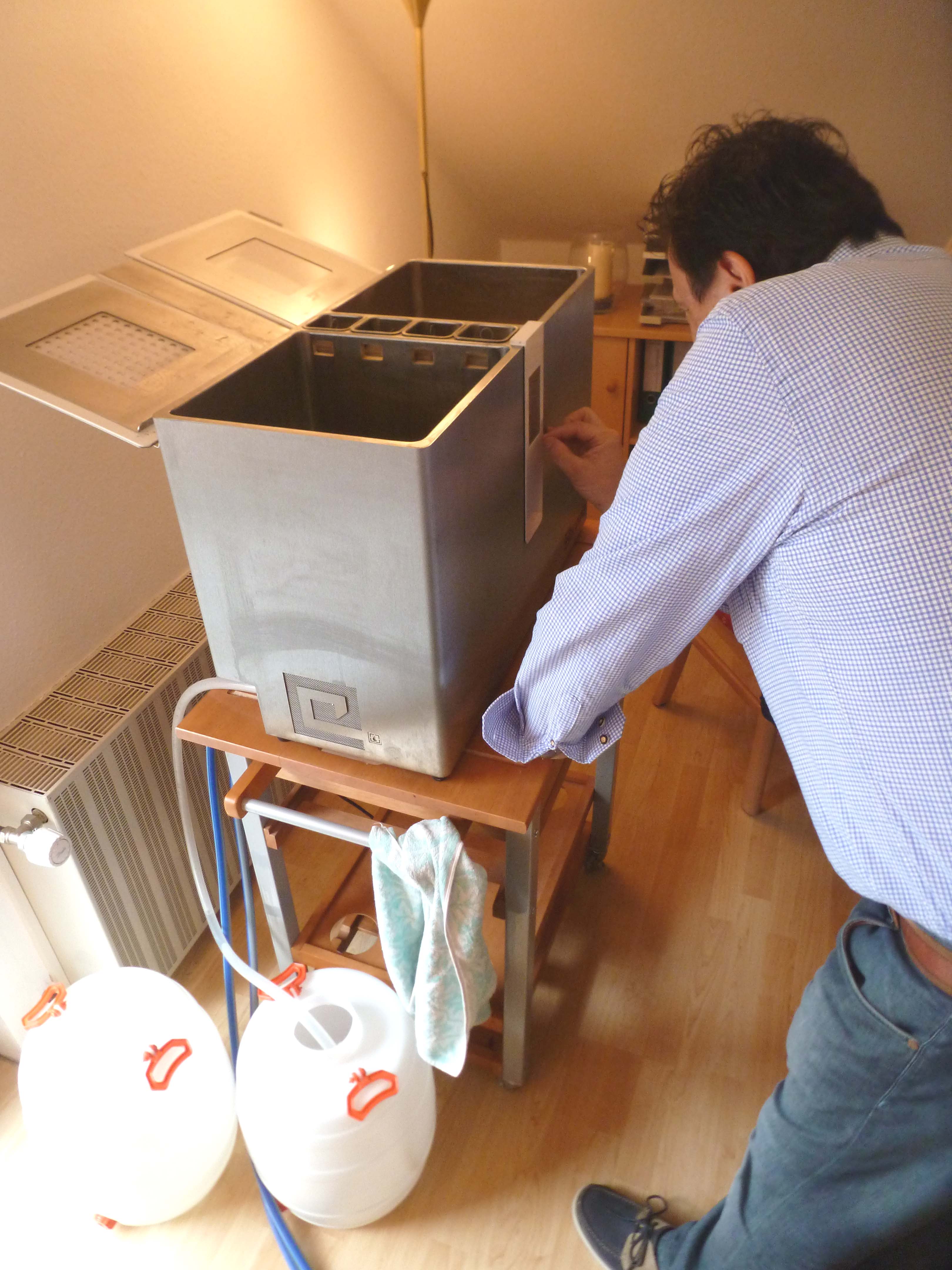 Was mir gleich beim Öffnen des Gerätes auffiel, war ein leicht modriger Geruch darin. Das Erklärte sich aber dadurch, dass das Vorführmodell auch nach dem Abpumpen ca. 200-300 ml Wasser drin behält, was aber für die künftigen Modelle behoben wird. Ebenso werden die Hopfenbehälter aus einem Stück bestehen, die jetzigen Teesiebe werden zu Kästchen die sich nur im eingesetzten Zustand verriegeln lassen und die Wasserauslässe von den Hopfenkästchen werden direkt in den Würzekessel (der linke Kasten) geleitet über wellenförmige Ausschnitte. Außerdem werden die Abflüsse verbessert mit einem leichten Gefälle im Boden zu diesen hin.
