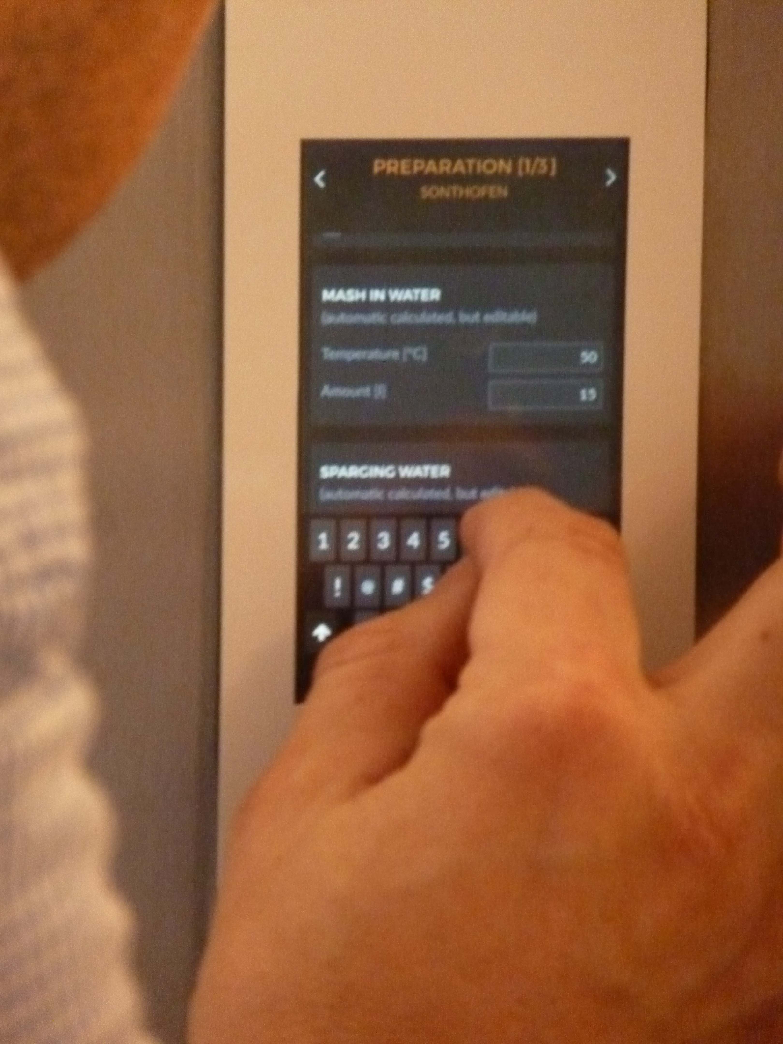 Gleich zu Beginn des Braustarts gab es ein Problem. Zsolt gab manuell ein Rezept für das Bier ein, welches nur 3 Kg Malz vorsah. Jedoch erkannte der Sensor nicht, dass der externe Wasseranschluss mit dem Schlauch angeschlossen war und aktivierte diesen daher nicht. Erst, als wir uns für ein bereits fest vorprogrammiertes Rezept entschieden, das 5 Kg Malz vorsah, akzeptierte der Brewie den externen Wasseranschluss. Dadurch war natürlich von vornehrein klar, dass der gewünschte Plato-Gehalt nicht erreicht wird.