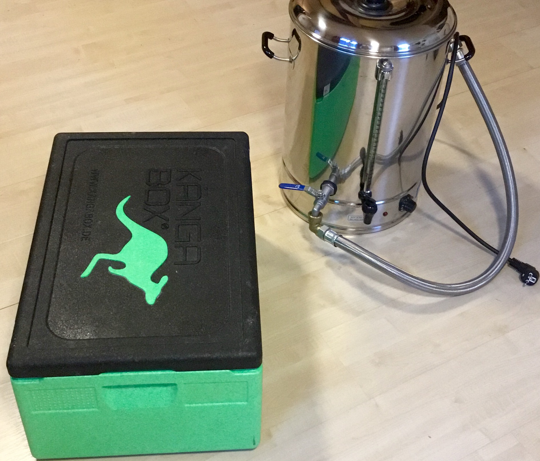 Nicht falsch verstehen, aber ich glaube, dass wird eine riesen Sauerei mit der Thermobox. Die Siebfläche ist riesig. Direkt nach dem Rausheben des Siebeinsatzes könnt ihr schon das erste mal scheuern. Das zweite mal, nachdem ihr versucht habt, zu zweit oder zu dritt, die Würze aus dem unhandlichen Behälter in den Kocher zu kippen. Das dritte mal, wenn ihr dann entnervt die Würze einzeln mit Bechern rüberschaufelt.