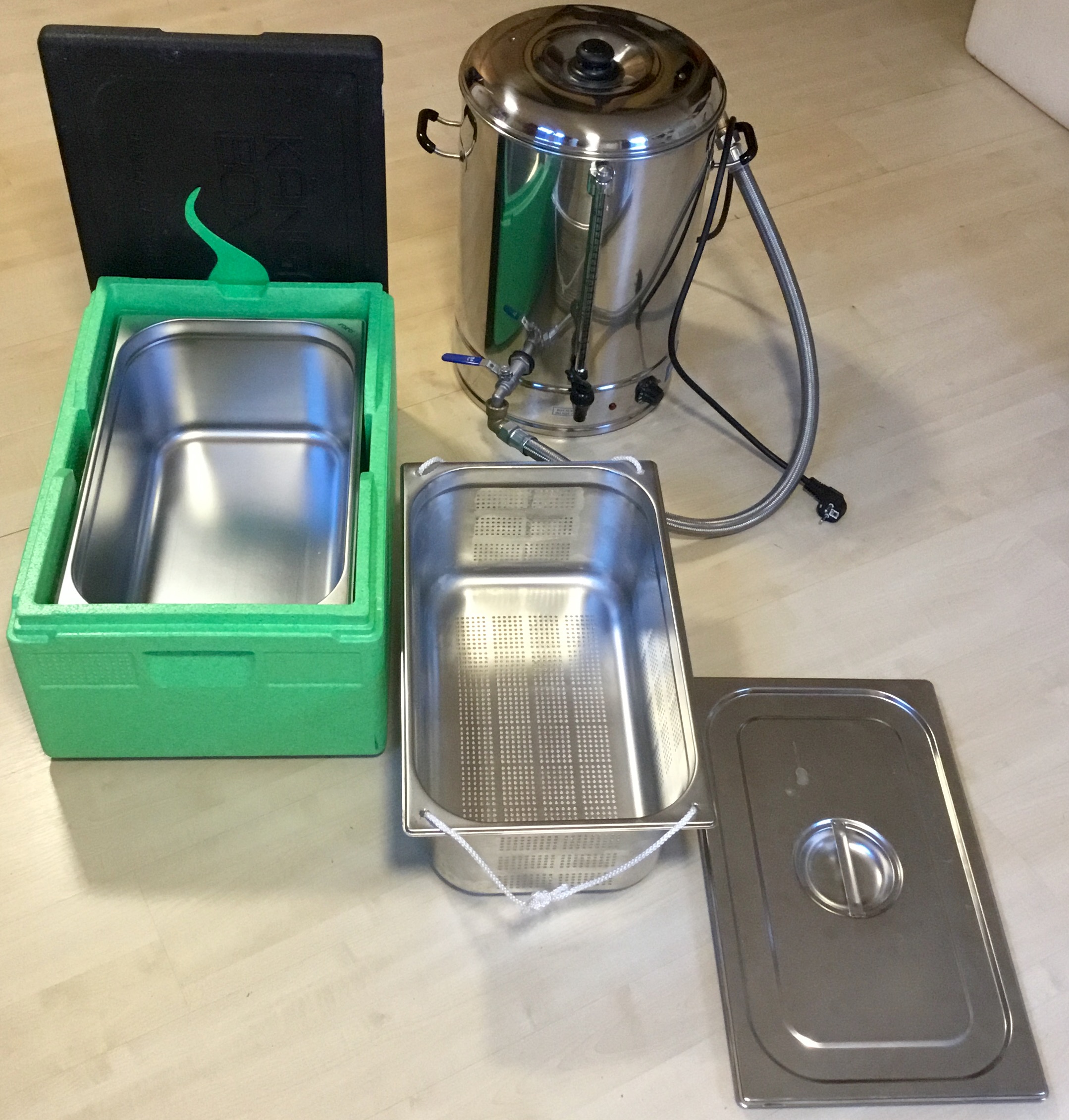Weil sich aus anderem Anlass (Sous-Vide-Garen in Kombination mit einem Fetisch für Edelstahl, insbesondere Gastronormbehälter) bei uns ein Set GN 1/1 mit Deckel und schmucker Warmhaltebox findet, keimte bei mir eine Idee. Also 1/1 Siebeinsatz dazu bestellt und zum Herausheben ein paar Löcher gebohrt und kräftige Schnur zum Herausheben durchgefädelt.