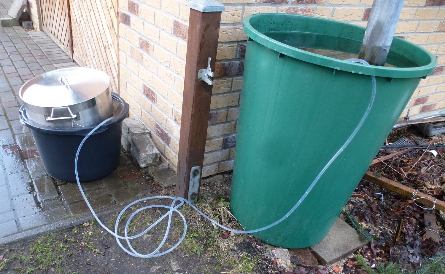 Da ich nicht viele Brau-Utensilien habe (auch keinen Kühler), habe ich nach dem Kochen den Sudtopf meist von außen abgekühlt. Im Winter geht das auf diese Weise recht zügig: