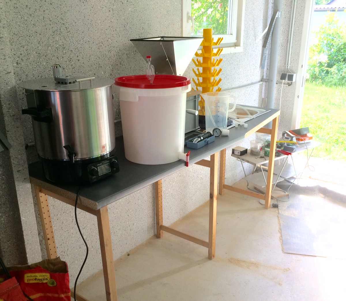 So. Die Brauecke in der Garage wird langsam. Morgen muß ich noch Wasser legen. Ich überlege noch, wieviel Wasserhähne ich vorsehen soll. Einen für den Flaschenspüler, einen für den Würzekühler und einen für Wasser. Das ist der aktuelle Plan. Ich freue mich immer, daß das Fallrohr genau da ist, wo man es braucht.
