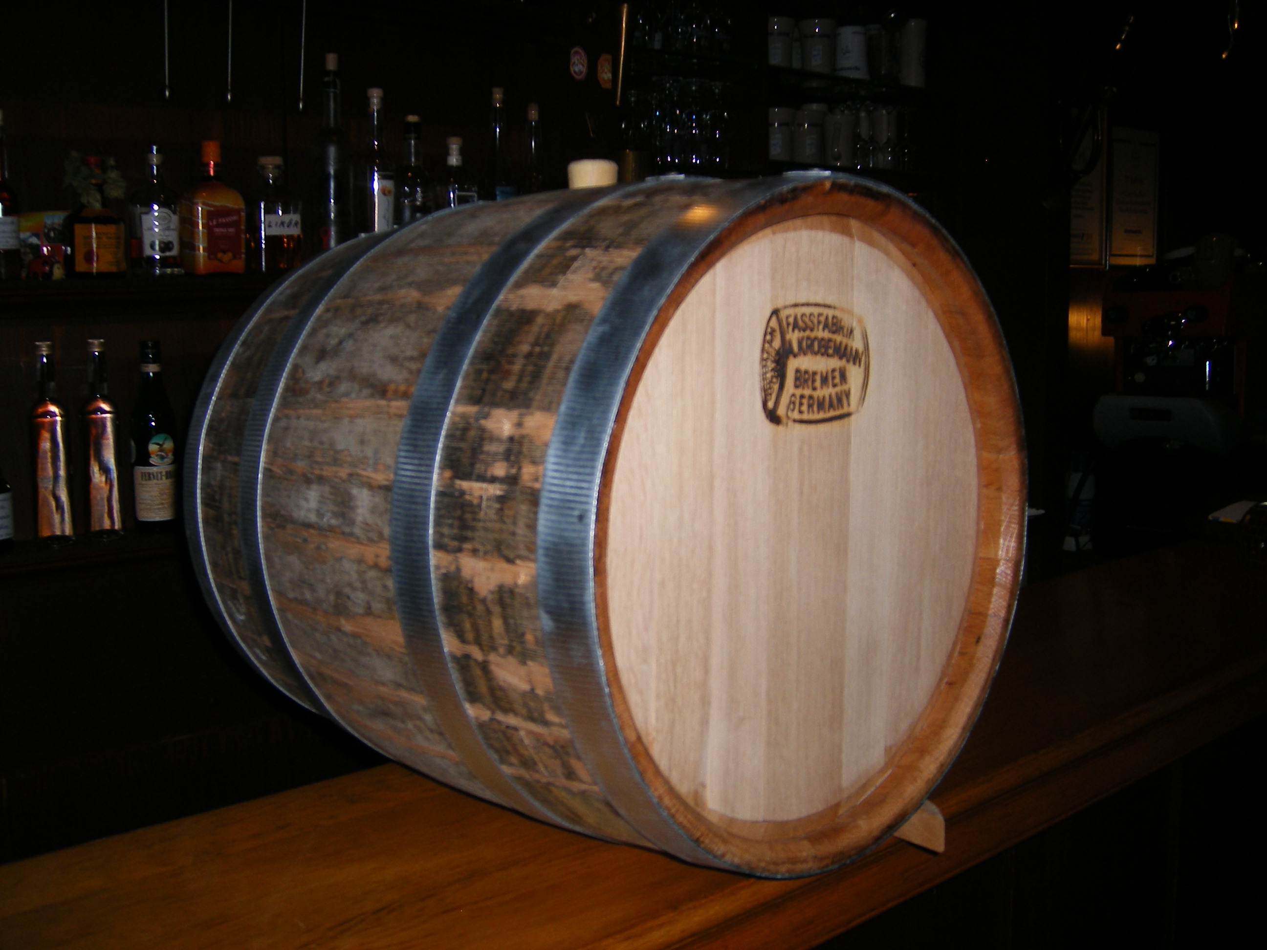 Es stand nun die ganze Zeit unbefüllt, sozusagen als Dekoration, auf meiner Theke. Letzte Woche hatte ich nun endlich die Gelegenheit, 2 Winzer wegen der richtigen Lagerung zu fragen. Ihr Vater war Büttnermeister und sie benutzen sowohl in ihrer Brennerei wie auch auf ihrem Weingut schon immer Holzfässer. Das größte hat 35hl. Als sie erfuhren, daß mein Fass über ein halbes Jahr nicht befüllt war, haben sie sorgenvoll geschaut. "Oh je, hoffentlich wird das wieder dicht und ist innen nicht verschimmelt!". Sie haben mir zu folgendem Vorgehen geraten:
