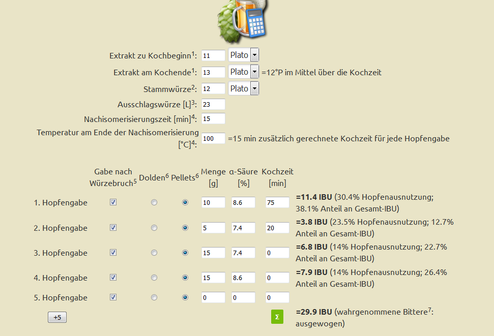 Die Hopfengabe mit 20 Minuten kochen habe ich außen vor gelassen. Bei einer Nachisomierung von 30 Minuten komme ich auf folgende Mengen: