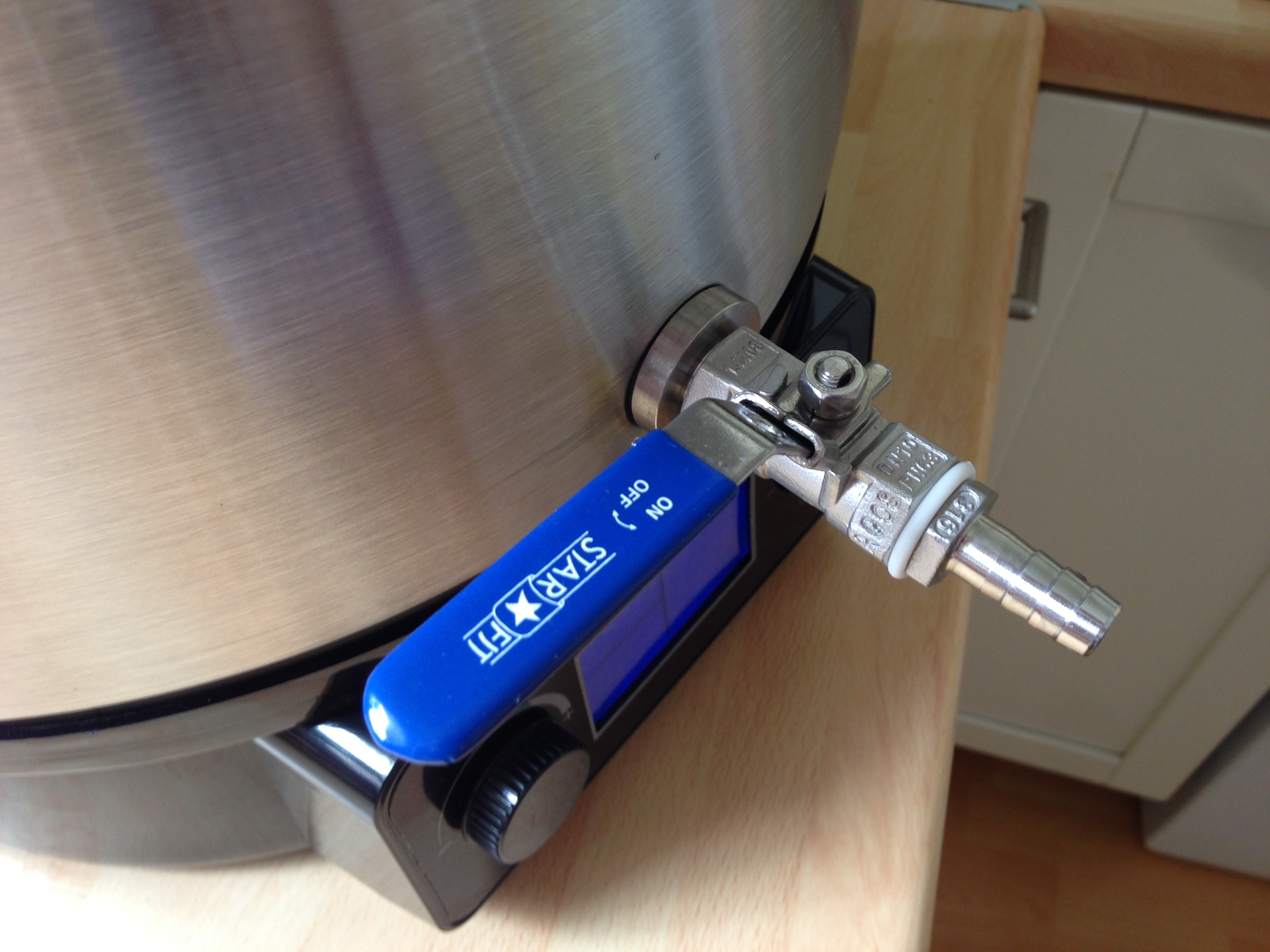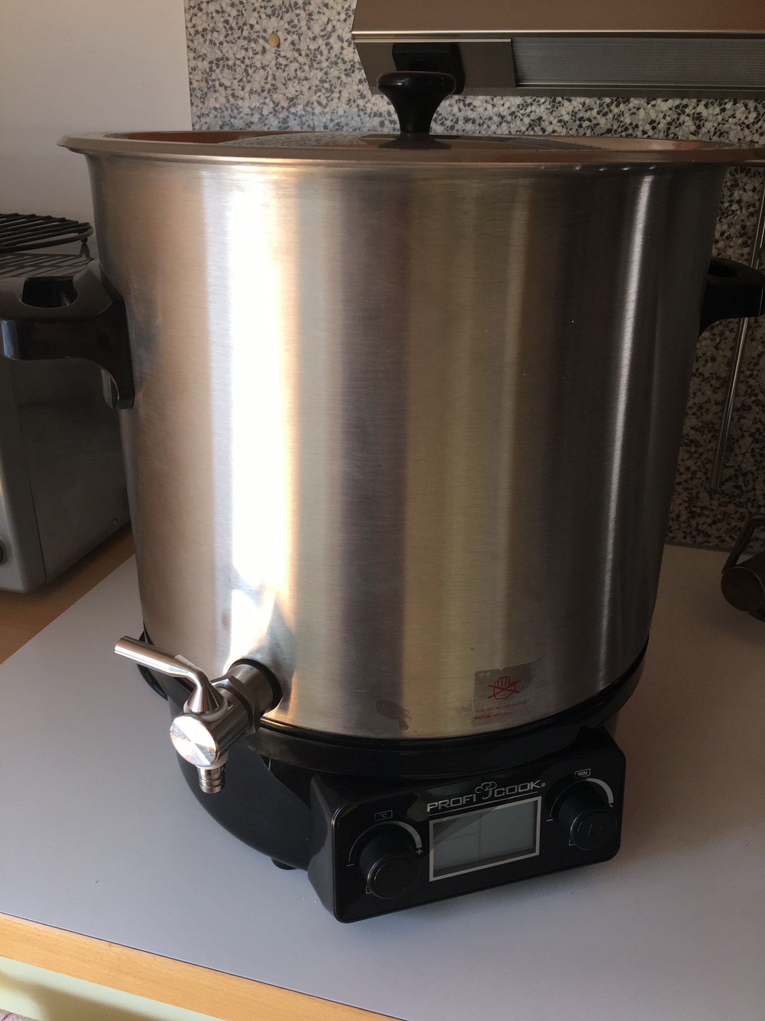 Auch hier gibt es die "Ü" Funktion - Hier wird dann dauerhaft gekocht. Bei der "Ü" EInstellung ist mir aufgefallen, dass der Timer dann nur auf "unendlich" gestellt werden kann. Schöner wäre auch hier eine Zeitangabe. Ich habe natürlich erstmal einen ordentlichen Hahn angebaut :-). Der mitgelieferte Hahn ist zum Bier Brauen weniger gut geeignet Auffällig ist, dass sich das Heizelement unter dem inneren Kreis befindet. Bei der analogen Version ist das übrigens auch so. Beim Silvercrest / Proficook ist es unter dem mittleren Ring angebracht. Aufheizraten: bummelig 1 Grad pro Minute Nachguss/Maischfunktion:
