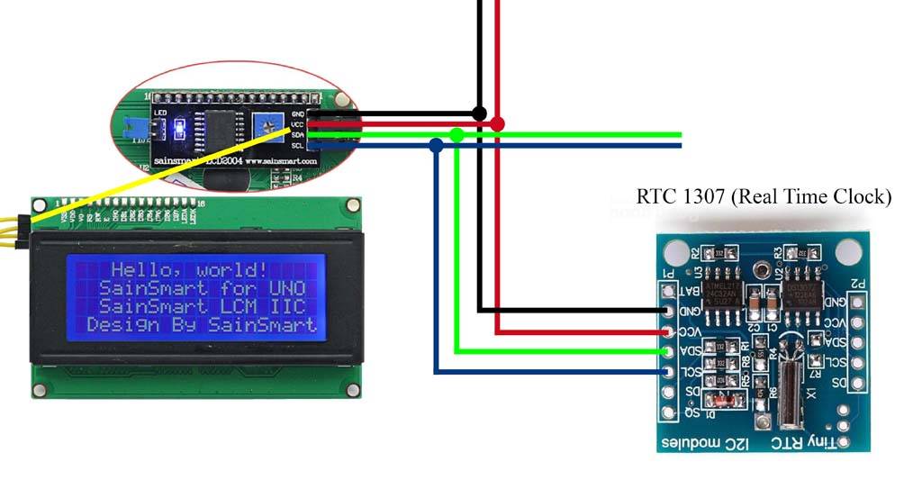 Es gibt verschiedene RTC für den Arduino/RasPi, ich benutze die recht preisgünstige Version RTC 1307, die bei den bekannten Versendern schon für ca. 7 EUR zu haben ist. Der Einbau ist denkbar einfach. Die RTC wird parallel zum Display angeschlossen (Vcc, GND, SDA, SCL), das wars!